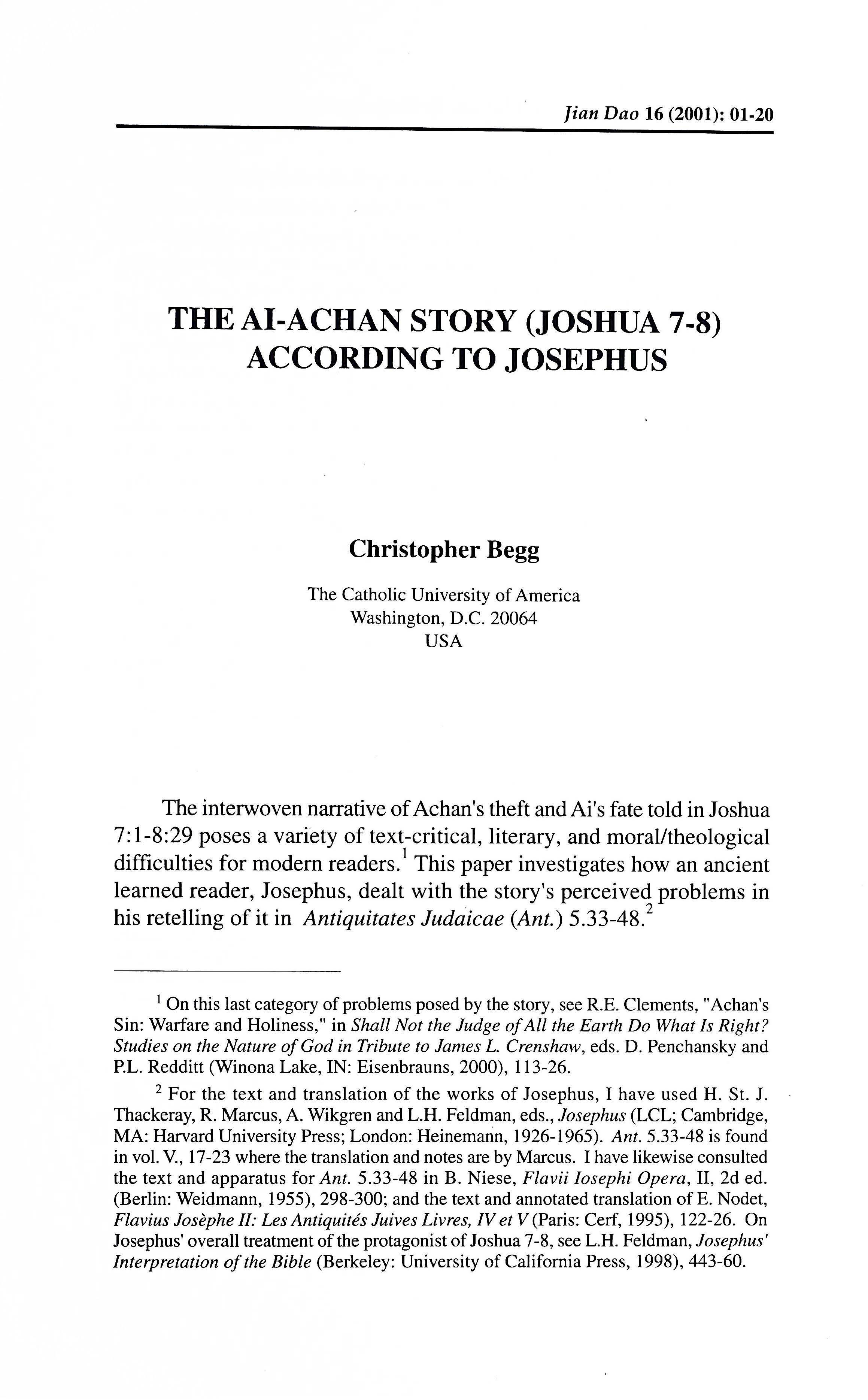 The Ai-Achan Story (Joshua 7-8) According To Josephus[約瑟夫筆下的艾城與亞干故事(書七-八)]/Christopher T. Begg 貝格