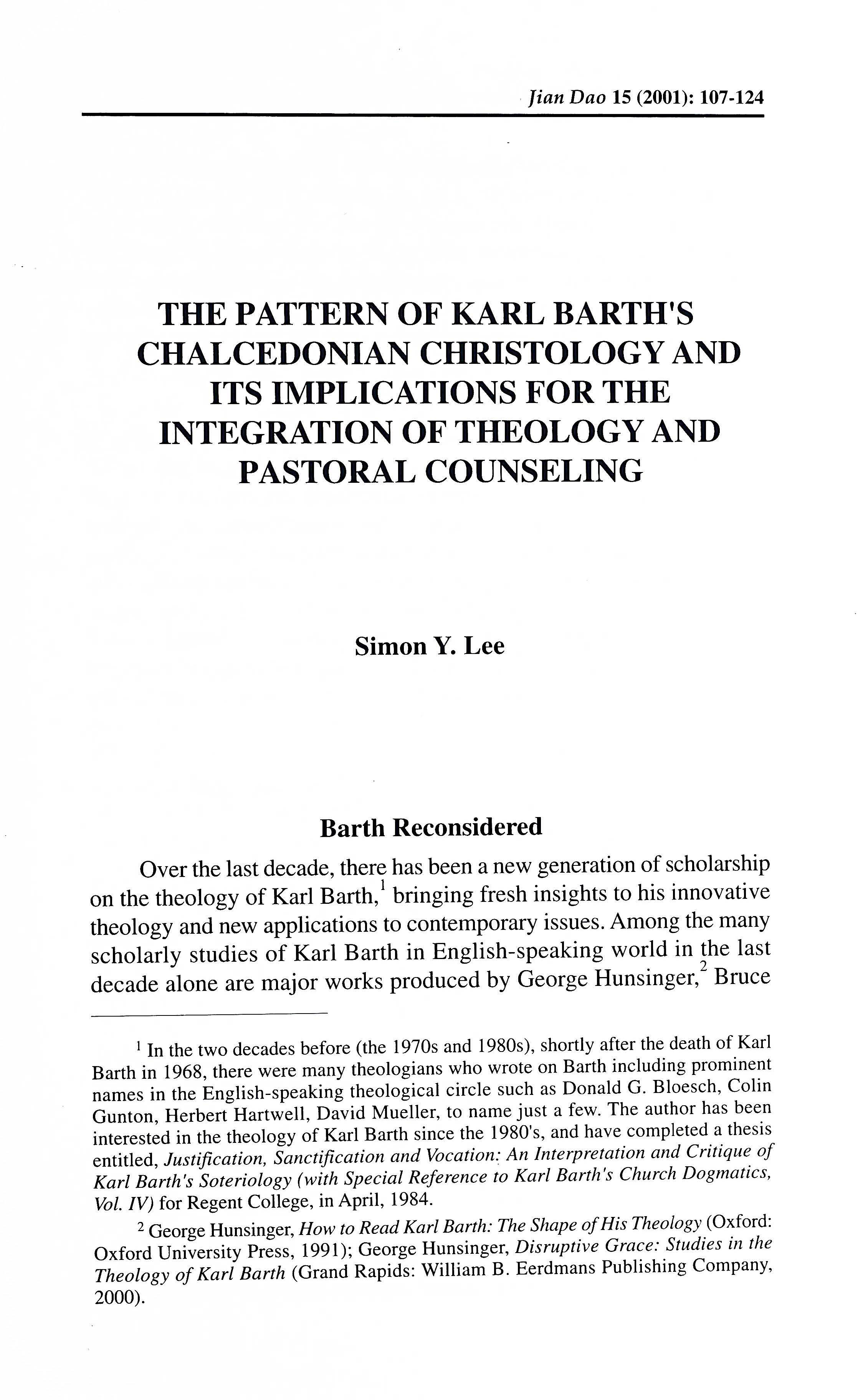 The Pattern Of Karl Barth's Chalcedonian Christology And Its Implications For The Integration Of Theology And Pastoral Counseling(巴特的迦克墩基督論模式及其對整合神學與教牧輔導之含義)/ 李耀全