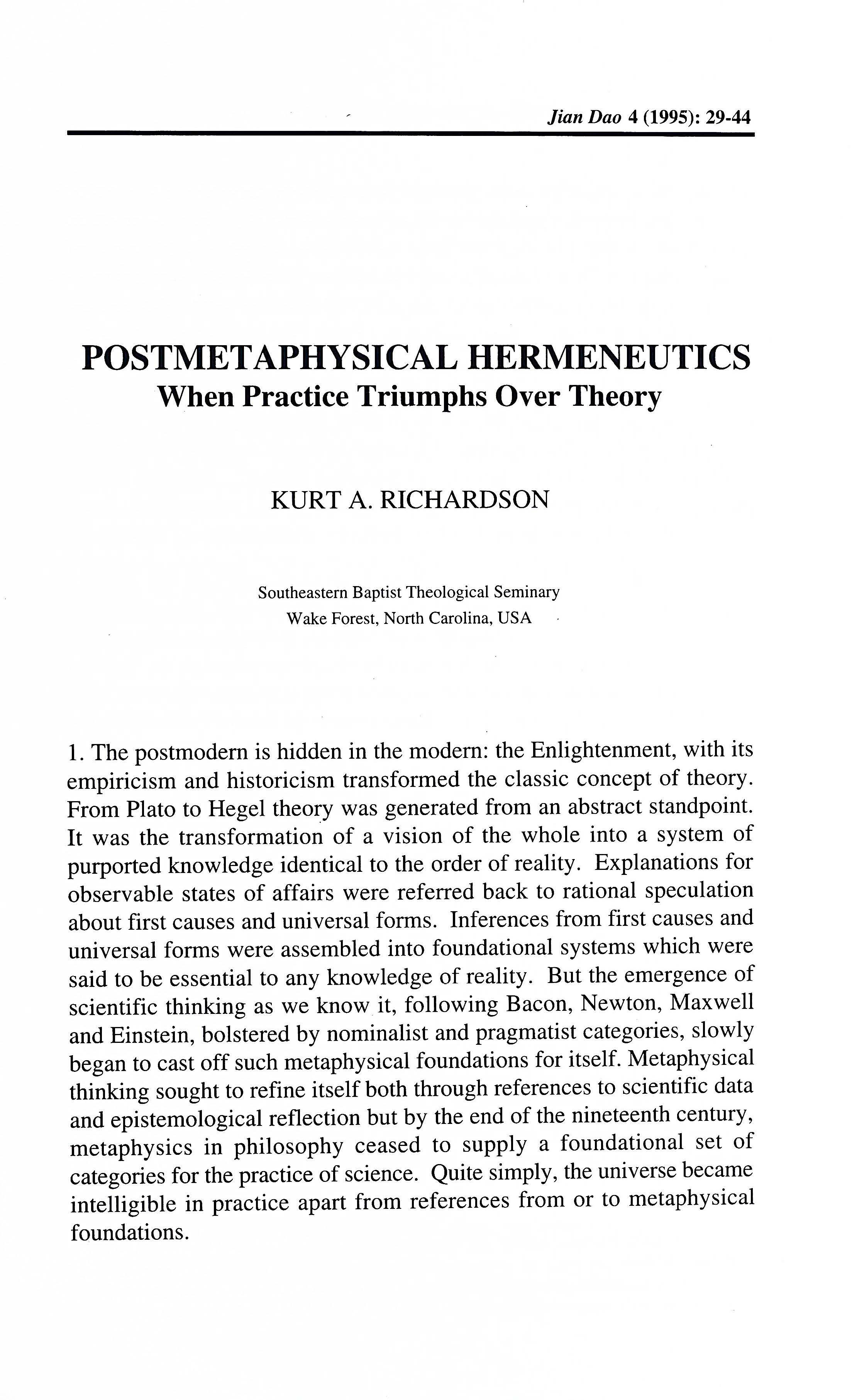 The Postmetaphysical Hermeneutics: When Practice Triumphs Over Theory(後形上詮釋學研究) / Kurt A. Richardson 理查森